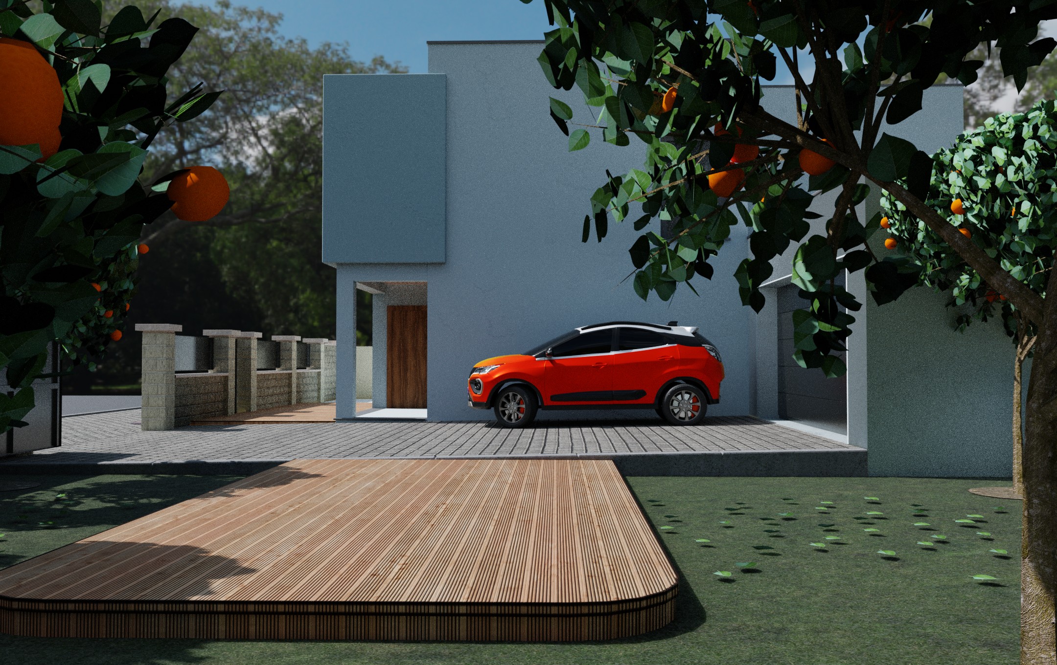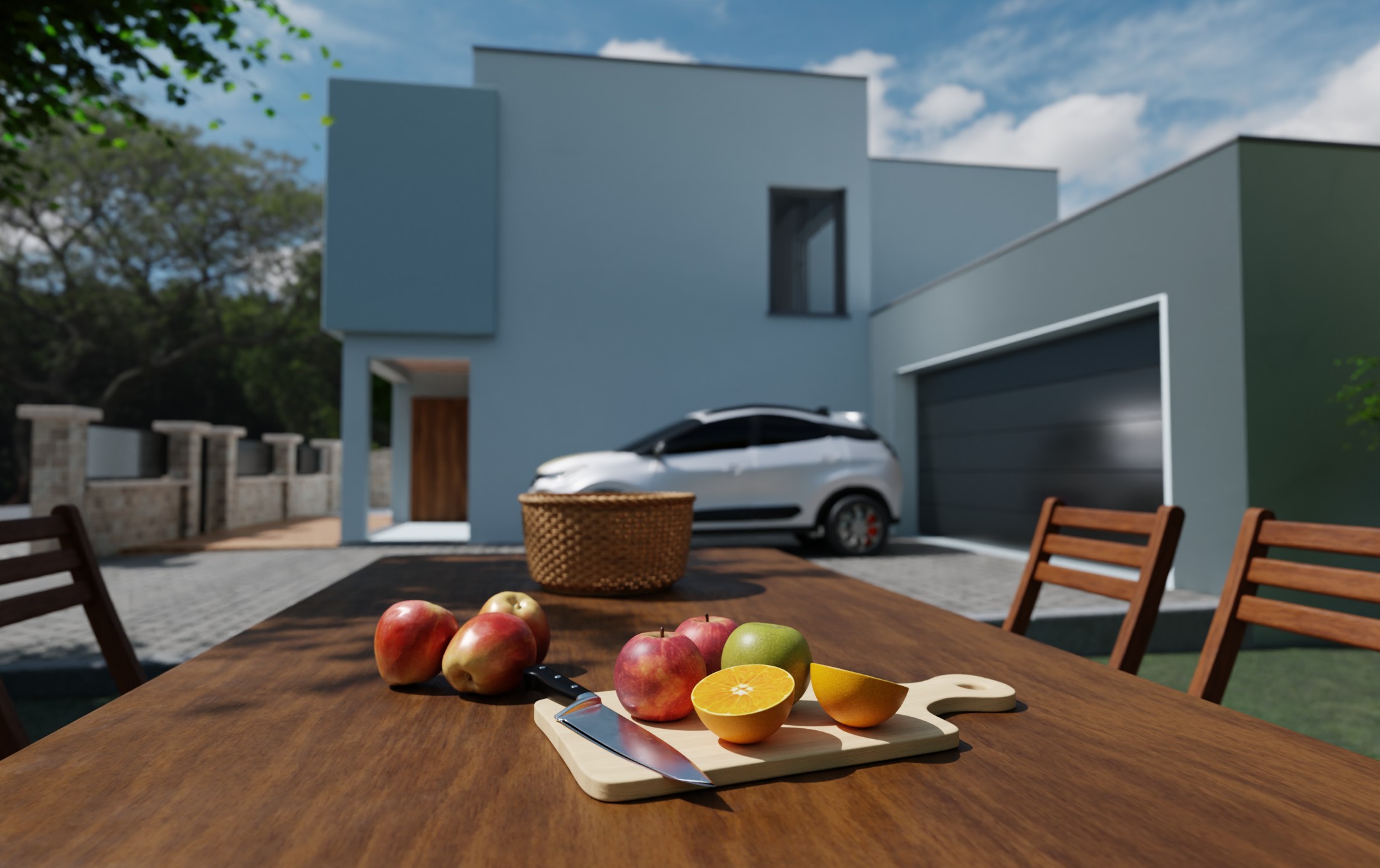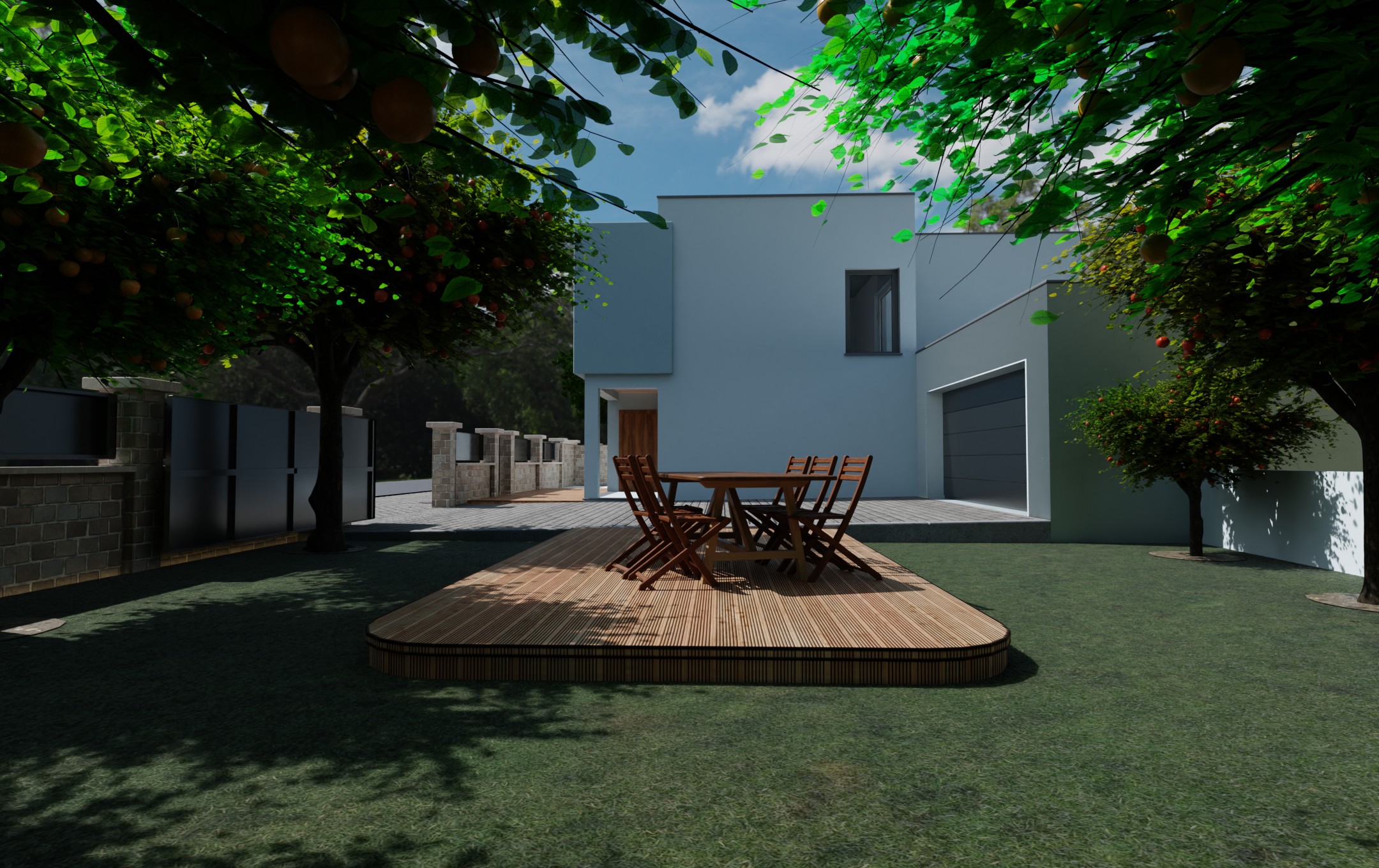 Modeling: The house, garage, surrounding walls, and other geometric elements are created as 3D models.