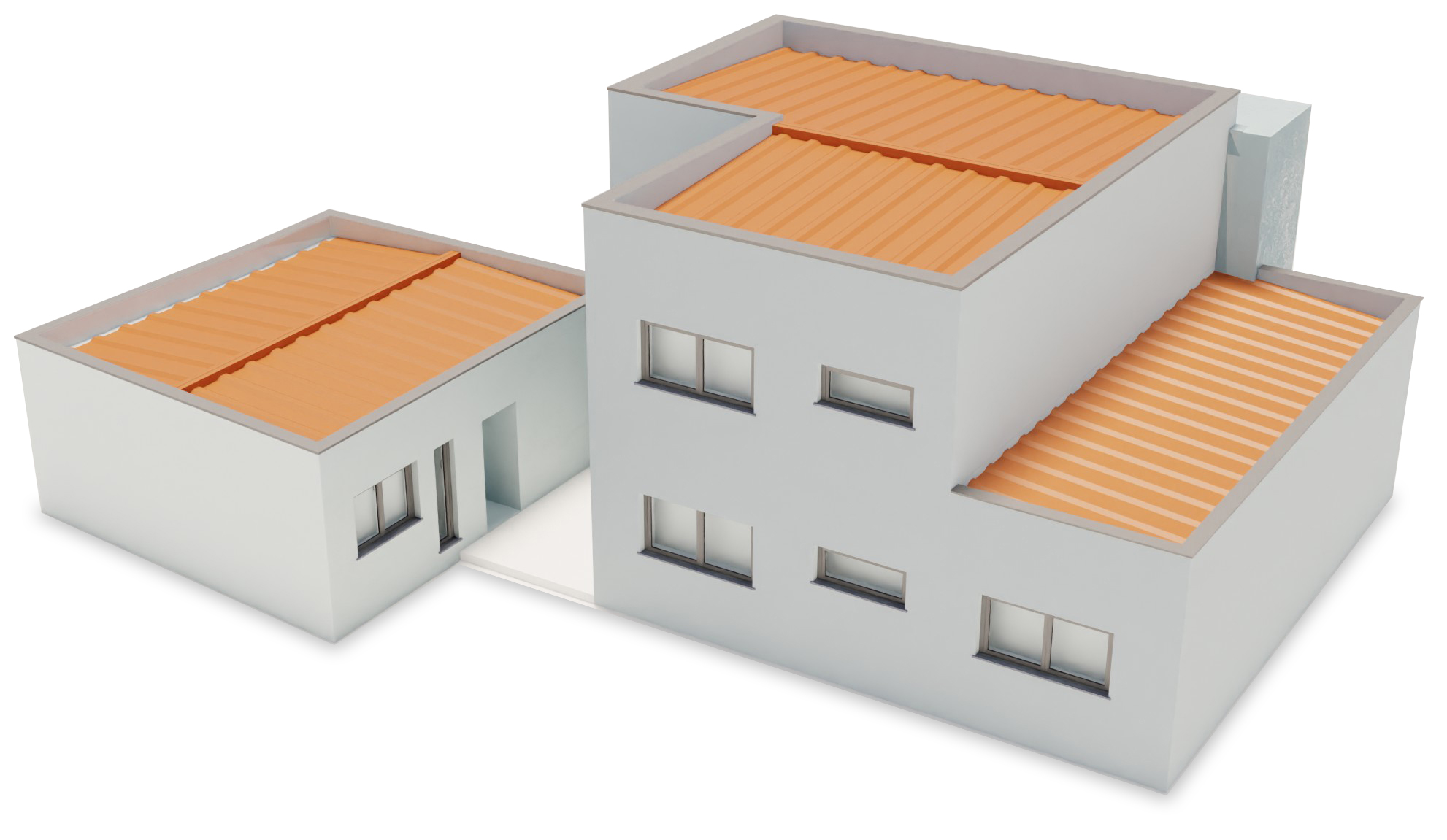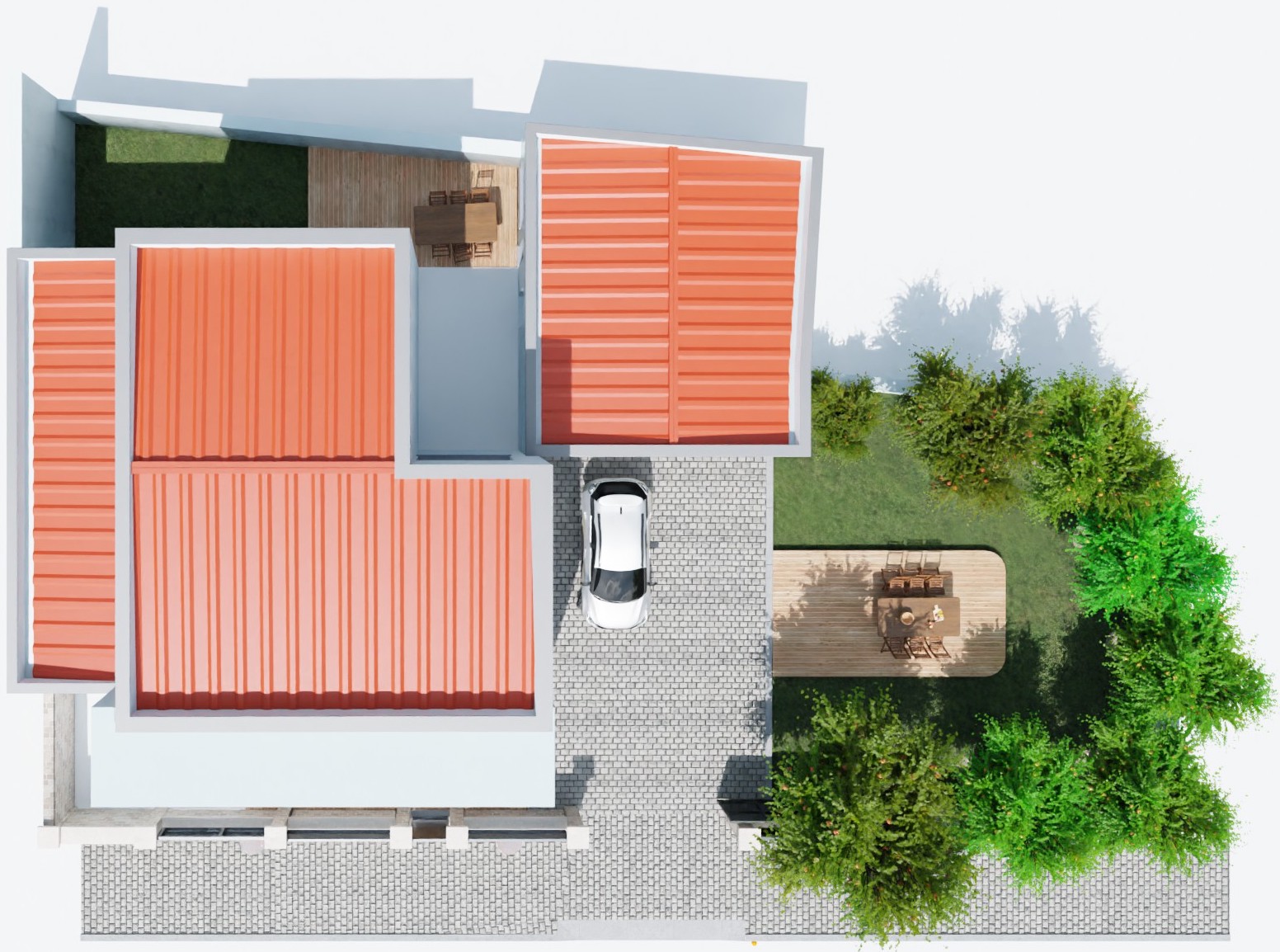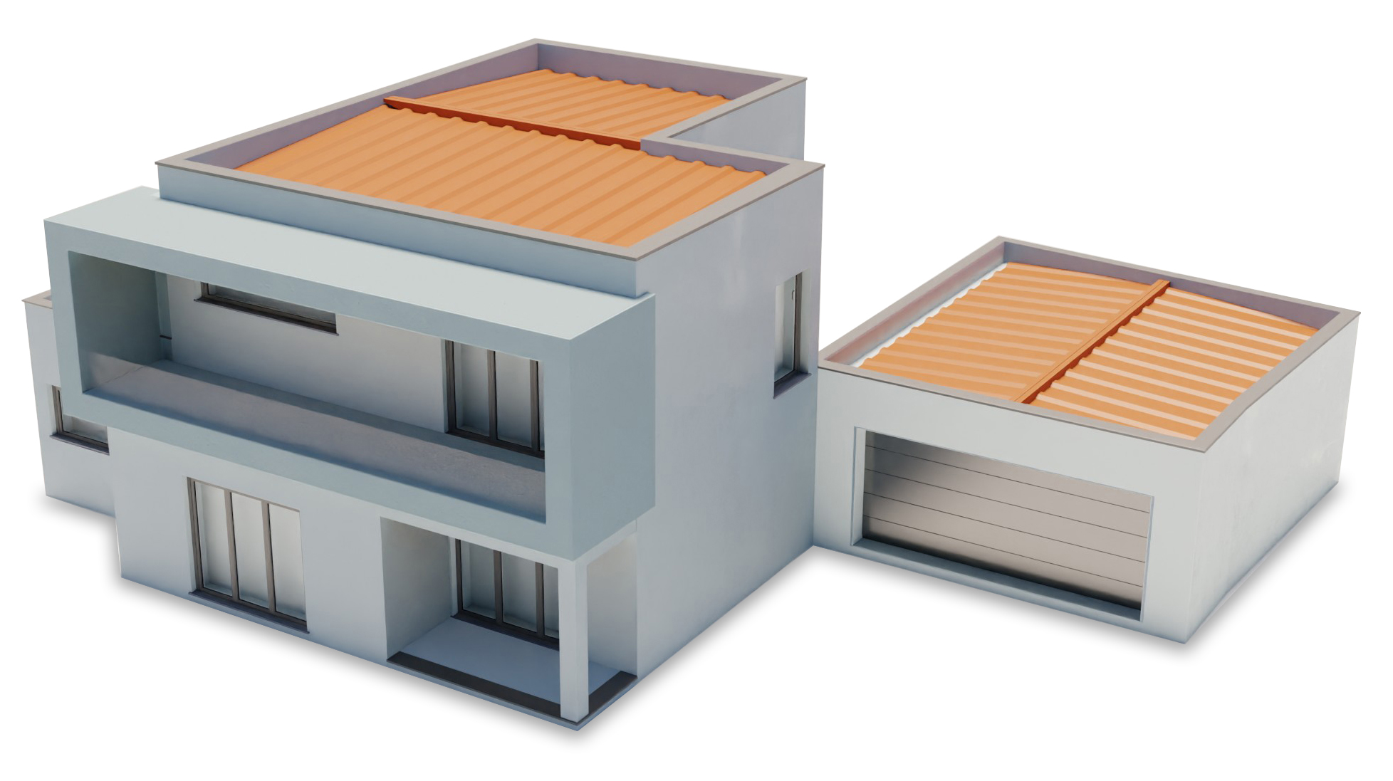 Modeling: The house, garage, surrounding walls, and other geometric elements are created as 3D models.
