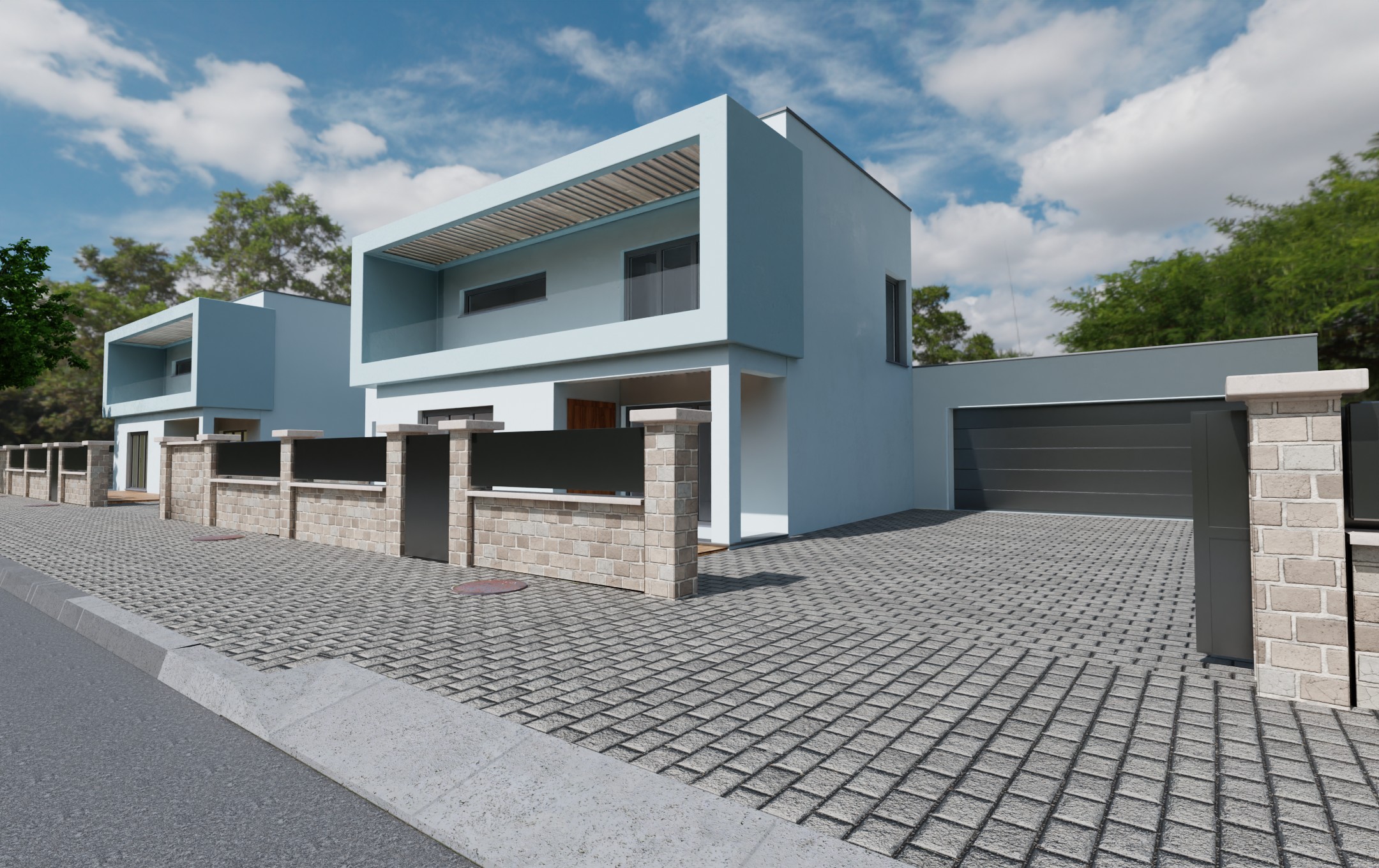 Materials and Textures: To achieve a photorealistic look, physically based rendering (PBR) materials are applied to every surface. This includes the light blue paint on the house, the stone texture of the wall, and the pavers on the driveway. PBR textures use a set of maps (like color, roughness, and normal maps) to define how light interacts with the material, which creates a sense of depth and detail.